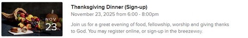 Join us for a great evening of food, fellowship, worship and giving thanks to God. You may register through our calendar (click below), or sign-up in the breezeway.