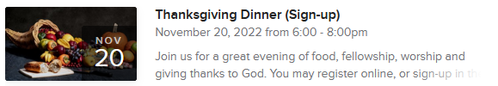 Join us for a great evening of food, fellowship, worship and giving thanks to God. You may register through our calendar (click below), or sign-up in the breezeway.