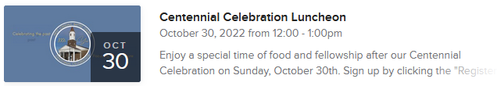 Enjoy a special time of food and fellowship after our Centennial Celebration on Sunday, October 30th.