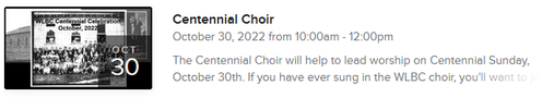 The Centennial Choir will help to lead worship on Centennial Sunday, October 30th. If you have ever sung in the WLBC choir, you'll want to join us for this special reunion!